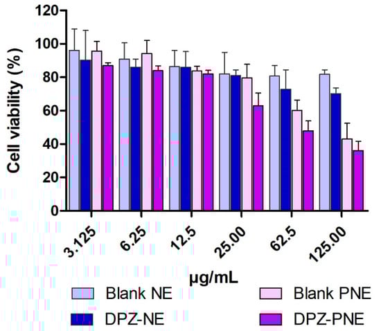 The effect of DPZ-NE and DPZ-PNE on cell viability was evaluated using Methylthiazolyldiphenyl-tetrazolium bromide (MTT) cytotoxicity assay, which measures the reduction of tetrazolium salt realized by intracellular dehydrogenases of viable living cells. In order to perform this assay, human nasal septum carcinoma cell line RPMI 2650 (Sigma Aldrich) (2 × 105 cells/mL) was plated in 96-wells plates (Corning Inc., Corning, NY, USA) and cultured in a humidified incubator at 37 °C in a 5% CO2 atmosphere for 24 h to facilitate adhesion []. Cells were grown in Eagle’s minimum essential medium (EMEM) supplemented with 2 mM glutamine, 1% non-essential amino acids (NEAA), 100 U/mL penicillin, 100 μg/mL streptomycin, and 10% heat inactivated fetal bovine serum (FBS). The cells were treated with different dilutions (3.125 to 125 µg/mL) of DPZ-NE, DPZ-PNE, and the blank formulations for 24 h, and then subsequently incubated with fresh medium and 10% MTT (5 mg/mL in phosphate buffered saline) for 2 h at 37 °C. Afterwards, the medium was removed carefully and 100 μL of dimethyl sulfoxide (DMSO) 99% purity was added to lysate the cells and dissolve the purple insoluble crystals of MTT. The cell lysate was transferred to a new 96-well plate and then the absorbance was read using a Microplate Autoreader at excitation/emission of 540/630 nm (Modulus Microplate Multimode Reader-Turner Biosystems, Sunnyvale, CA, USA). In a parallel manner, a negative control (cells without any stimulation or treatment) was processed for comparison. Absorbance values were considered directly proportional to cell viability.