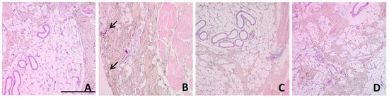 Optical microscopic images of nasal mucosa. (A) Negative control (non-treated pig); (B) positive control (pig treated with isopropyl alcohol); (C) pig treated with DPZ-NE, and (D) pig treated with DPZ-PNE. Hematoxylin and eosin stains nuclei blue/black while keratin and cytoplasm are stained red. The arrow indicates infiltration of inflammatory cells. Scale bar = 100 µM.