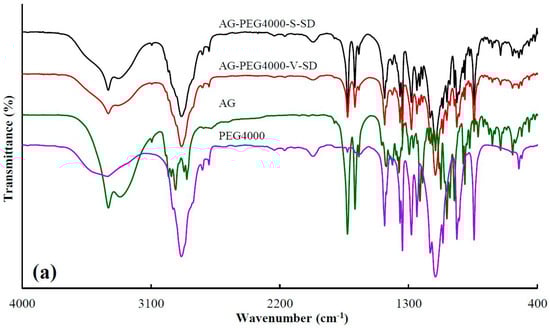 Table 1 showed the peak position at 3317 cm−1, corresponding to –OH vibrations of AG, where the blue shift in peak position were obviously observed upon mixing with carriers as SDs. This may be attributed to a change in the groups that form hydrogen bonds. The formation of intermolecular hydrogen bonds in the pure AG originates from the interaction between the –OH of the two AG molecules. While SDs were prepared, the interaction between the –OH of AG and the –C=O of grafted PEG or the –OH of PEG resulted in the formation of intermolecular hydrogen bonds. The degree of –OH blue shift of AG in AG-grafted PEG–S–SD was higher than that of AG in AG–PEG–S–SD, which was ascribed to the stronger interaction between –C=O of grafted PEG and –OH of AG than that between –OH of PEG and –OH of AG. The FT-IR spectra showed the original AG intermolecular hydrogen bond was destroyed in the as-prepared SDs, which was beneficial to the dissolution of AG. At the same time, the formation of an intermolecular hydrogen bond between AG molecule and carrier was beneficial to the SD stability [,].