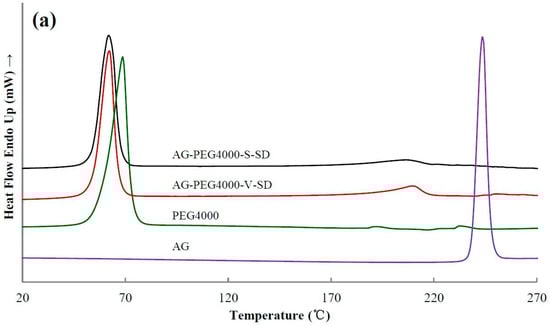Figure 4 shows the DSC thermograms of some samples. As shown in Figure 4, the DSC thermogram of pure AG was typical of a crystalline substance with a sharp endothermic peak at 243 °C corresponding to its melting point. Table 2 shows the melting temperature (Tm) of all the samples near 190–250 °C. Compared with the SDs prepared with grafted PEG as carrier, the Tm of the SDs prepared with PEG as carrier was lower. Since some of the ester bonds of the grafted PEG were broken during heating, both the compatibility of the grafted PEG and AG as well as the solubility of AG in the grafted PEG were reduced, leading to the increase of Tm of the SDs prepared with grafted PEG as carrier material. In all the SDs, a small endothermic peak was observed at about 220 °C (Figure 4 and Table 2). This result indicated that the completely amorphous AG–SD had not been obtained. AG was in a partial-amorphous and partial-crystal state in the as-prepared SDs. However, the glass transition was not observed on the DSC curve of the as-prepared SDs. This was due to the carrier material melting earlier, allowing the amorphous AG to dissolve in earlier melted carrier material during the heating of the DSC studies.