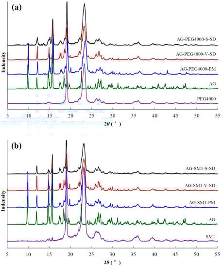 The characteristic diffraction peaks of crystal AG were present in all PMs (Figure 5). Compared with PMs, the intensity of AG diffraction peaks decreased significantly in the SDs. The AG diffraction peaks at 9.8°, 12.0°, and 15.7° were not disturbed by the carriers, so their peak areas were chosen to estimate the relative crystallinity of AG in the SD. The peak areas at 9.8°, 12.0°, and 15.7° in the SD prepared by spray-drying method and the SD prepared by the vacuum-drying method (except AG–SM6–V–SD) were about 30% and 60–70% of the corresponding PM, respectively. The crystallinity of AG in the SD prepared by spray-drying method was lower than that in the SD prepared by vacuum-drying method. The reason is that the ethanol solution of AG and carrier was rapidly evaporated, and the AG mostly solidified in an amorphous state during the process of SD prepared by spray-drying method. The solvent evaporation rate was slower, and the recrystallization of AG occurred during the process of SD prepared by vacuum-drying method, leading to the higher crystallinity of AG in the SD prepared by vacuum-drying method (except AG–SM1–V–SD and AG–SM6–V–SD).