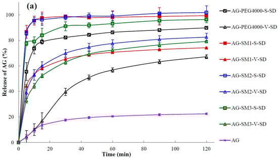 The dissolution of a poorly water-soluble drug is crucial where it is the rate-limiting step in the oral absorption process from a solid dosage form and is an important parameter related to bioavailability [,]. The dissolution profiles of pure AG and SDs are illustrated in Figure 7. It can be seen that the maximum dissolution percentage of pure AG in 120 min was only 22% when using water as the medium (Figure 7).