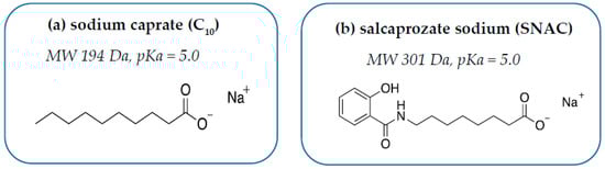 Numerous compounds including surfactants, bile salts, bacterial toxins, chelating agents, and medium-chain fatty acids (MCFA) proved to be effective PEs for poorly permeable molecules in in vitro and in vivo studies [10,13]. A comprehensive analysis of the majority of intestinal PEs from these classes that are used with peptides is available [10]. PEs that increase permeability across Caco-2 monolayers, isolated intestinal tissue mucosae, and in rodent models may also improve oral BA in humans, but this is not guaranteed since such studies are predominantly based on admixtures with payloads, not oral formulations. Furthermore, scale-up of the final formulation, PE dose, dilution, spreading, and release of both PE and payload during transit in the human GI tract, as well as the influence of enzymes, bile salts, and lipids in human intestinal fluids, must all be taken into account when attempting to make oral BA predictions for humans from preclinical studies. There are currently over 50 clinical trials in which PEs were shown to increase oral absorption of poorly permeable molecules, mostly achieved using surfactants [14]. The most widely tested PEs in these trials include Eligen® carriers, MCFAs, acyl carnitines, bile salts, and ethylenediaminetetraacetic acid (EDTA) [15]. The MCFA, sodium caprate (C10), and the C8 derivative, salcaprozate sodium (SNAC), are of particular interest as they had over 20 years of development in proprietary delivery platforms and have been tested in human trials more than any other PEs. C10 was originally developed as the main component of an oral solid-dosage form (GIPETTM, Gastro-Intestinal Permeation Enhancement Technology) by Elan Pharma (Dublin, Ireland), and then, following licensing, by Merrion Pharmaceuticals (Dublin, Ireland) for oral peptide delivery, and by Ionis Pharmaceuticals (Carlsbad, CA, USA) for oral delivery of antisense oligonucleotides. SNAC was developed by Emisphere (NJ, USA) as the lead agent of its Eligen® carrier technology. Novo Nordisk (Bagsværd, Denmark) licensed both GIPETTM and Eligen® to assess with their insulin and GLP-1 analogs, ultimately opting to focus on an SNAC tablet formulation with their highly potent, stable, long-t½ (160 h) injectable GLP-1 analog, semaglutide, for advanced clinical development, while abandoning GIPET™, along with further attempts to create an oral insulin.