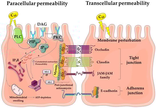 Nonetheless, these studies involving pharmacological inhibitors are not definitive proof of a discrete paracellular effect. Impedance spectroscopy in HT29/B6 human intestinal monolayers also supports the dataset showing that C10 acts via a paracellular mechanism; this was associated with removal or redistribution of the TJ proteins claudin 5 and tricellulin [37]. However, in the absence of data supporting the absence of transcellular perturbation (a dye uptake assay), the data from this study do not provide conclusive evidence for a paracellular mode of action either. It is impossible to ignore the evidence from a wide range of studies that C10 also disrupts cell membranes at 8–13 mM. C10 also caused Caco-2 cell leakage of intracellular ATP from Caco-2 cells [33], a likely consequence of plasma membrane perturbation. One interpretation is that cells respond to the initial membrane perturbation challenge by C10 with compensating intracellular signaling processes involved in mucosal repair, beginning with disbandment of TJs, and concluded by epithelial resealing [38].