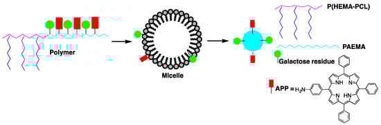 The targeting and PDT efficiency of amphiphilic galactosyl (Gal) and 5-(4-aminophenyl)-10,15,20-triphenylporphyrin (APP) poly(2-aminoethyl methacrylate)-polycaprolactone (Gal-APP-PAEMA-PCL) micelles was assessed by Wu et al. []. Poly(2-aminoethyl methacrylate)-polycaprolactone (PAEMA-PCL) was prepared by a combination of ring opening polymerization and reversible addition–fragmentation chain transfer (RAFT) polymerization, with Gal-APP-PAEMA-PCL being obtained after conjugation with lactobionic acid and mono-aminoporphyrin (APP), Figure 1.