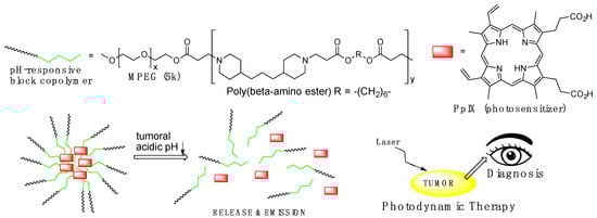 The difference of pH values observed in tumor tissue, usually around 6.4–6.8, and normal tissue (pH = 7.4), has been used as the base for the development of more efficient therapeutic approaches in drug delivery and biomedical imaging. pH-responsive block copolymer (Pluronic) micelles, capable of demicellization at the slightly acidic pH of tumor tissue, were used as delivery systems, increasing the accumulation in tumor tissues and releasing the sensitizer to produce fluorescence and reactive oxygen species (ROS) for simultaneous diagnosis and therapy purposes in the tumor site, Figure 2. Koo et al. combined hydrophilic methoxypoly(ethylene glycol) (MPEG) with pH-sensitive poly(β-amino ester), which yielded a pH-responsive MPEG-poly(β-amino ester) block copolymer due to its tertiary amines (pKb = 6.5), with an average molecular weight of 17.4 kDa. Loading of hydrophobic protoporphyrin IX (PpIX) into polymeric micelles of MPEG-poly(β-amino ester) block copolymer gave PpIX-loaded pH-responsive polymeric micelles (PpIX-pH-PMs) with an average size of about 122 nm, which was far larger than that of the unloaded micelles (42 nm), an indication that the PpIX molecules were, in fact, trapped in the hydrophobic inner cores of the micellar platforms [].