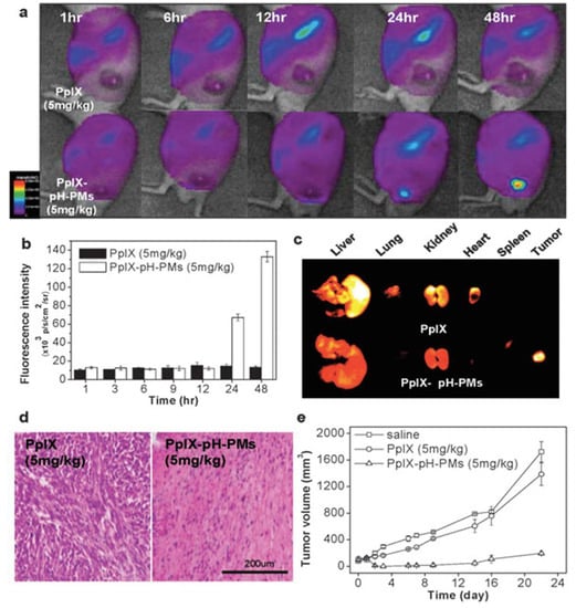 Non-invasive fluorescence imaging and photodynamic therapy (PDT) with PpIX-pH-PMs in live SCC7 tumor-bearing mice. In vivo time-dependent whole body imaging after injection (a); in vivo quantification of tumor target specificity of free PpIX and PpIX-pH-PMs (b); ex vivo images of organs (liver, lung, spleen, kidney, heart) and tumors (c). (d) H&E staining of tumor tissues 10 days after treatment. (e) Tumor growth of SCC7 tumor-bearing mice treated with drug injection and irradiation. Results represent means ± SDs. (n = 2). Reproduced from Reference [] with permission from the Royal Society of Chemistry, 2010.