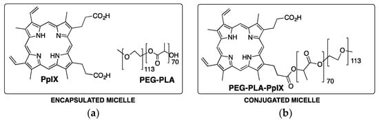 Biocompatible and biodegradable block copolymer, poly(ethylene glycol)-b-poly(d,l-lactide) (PEG-PLA) was used to produce micellar nanocarriers for the delivery of PpIX []. Two types of PEG-PLA-PpIX micelles were produced: one through a non-covalent hydrophobic encapsulation methodology and another by covalent bond of PpIX to the hydroxyl group of PEG-PLA, Figure 4. TEM characterization shows that PpIX-containing micelles had a spherical morphology, and DLS analysis indicated that the micelle diameters were around 30 nm. Depending on the incorporation strategy (physical encapsulation vs. covalent conjugation) and loading density, PpIX may occur as a monomer, dimer, or aggregate inside the micelle core, which directly affect the fluorescence intensity and ROS production and, therefore, the therapeutic efficiency of the resulting micelles in aqueous solution.