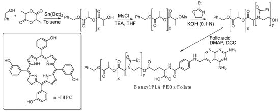 Synthetic strategy for folate-conjugated PEOz-PLA copolymer used to prepare pH-responsive micelles to encapsulate m-THPC.