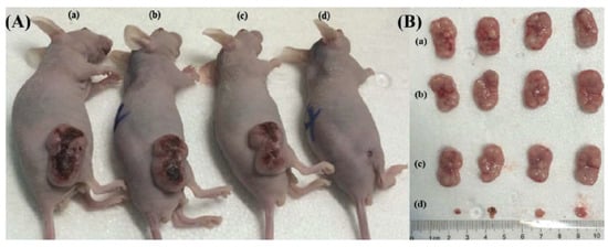 (A) Human oral epidermoid carcinoma (KB) tumor-bearing nude mice and (B) excised KB tumor images after 14 days of treatment with (a) phosphate-buffered saline (PBS), (b) α-CD-ss-Ce6 NPs without laser, (c) free Ce6 with laser, and (d) α-CD-ss-Ce6 NPs with laser. Reproduced from Reference [] with permission from Small, 2016.