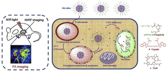 Preparation of a copolymer composed of MPEG and decylamine-grafted poly(l-aspartic acid) (MPEG-b-PAspDA) allowed the preparation of micelles for the encapsulation of chlorin e6 (Ce6) and cypate (Cy). The incorporation of the sensitizer and the dye—highly fluorescent in the infrared region—into the micelles opened the way to developing nanotheranostic platforms for precise tumor localization via dual photoacoustic (PA)/near-infrared fluorescence (NIRF) imaging and, simultaneously, more efficient cancer treatment via sequential and synergistic photothermal therapy (PTT)/photodynamic therapy (Figure 10) []. The preparation of the copolymer MPEG-b-PAspDA was achieved through the ring-opening polymerization of β-benzyl L-aspartate N-carboxyanhydride with 12 kDa MPEG and subsequent aminolysis of decylamine. Mixing Ce6, Cy, and the copolymer in dimethylsulfoxide, with further dispersion into water and dialysis, yielded micelles with high loading capacity (20% (w/w)) for both Ce6 and Cy. TEM imaging indicated that the micellar structures had a spherical shape and an average size of 55 nm, smaller than dimensions obtained by DLS (63.6 nm). Furthermore, stability of these micelles at pH = 7.4 protect Ce6 from chemical degradation at physiological pH, due to its effective encapsulation within the micellar cores. The performance of Cy/Ce6-micelles towards cellular internalization, photostability, and PTT and PDT activity were also evaluated, in vitro, using 4T1 murine breast cancer cell lines.