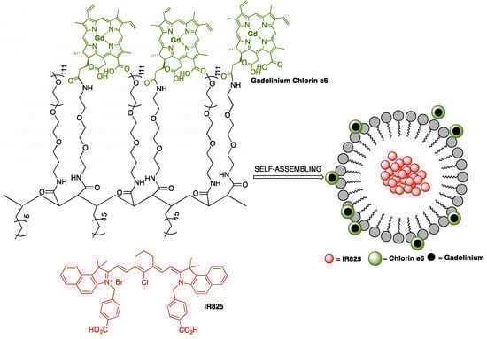 A multifunctional polymeric nanomicelle system containing Ce6 and near-infrared dye IR825 was conceived by Gong and co-workers for multimodal imaging-guided combined photothermal and photodynamic therapy applications []. Poly(maleic anhydride-alt-1-octadecene) (C18PMH) was primarily reacted with a long PEG-amine (5 kDa) and a short diamine-PEG (324 Da), yielding C18PMH-PEG5k/PEG324-NH2, followed by conjugation with Ce6. The obtained Ce6-grafted amphiphilic polymer (C18PMH-PEG-Ce6) was then used to encapsulate IR825, producing IR825@C18PMH-PEG-Ce6 nanomicelles that comprise both photosensitizer and photothermal agents, Figure 11. The loading of Ce6 and IR825 were 3.8% and 10%, respectively. The encapsulation of IR825 leads to a significant increase in the size of C18PMH-PEG-Ce6 micelles. From DLS measurements, it was possible to conclude that micelles size increase from about 26 nm (without dye) to around 107 nm. This is in agreement with SEM images, showing micelles with uniform morphology and size diameters ranging between 100 and 200 nm. The carboxyl groups on Ce6 promote negatively charged micelles, which were characterized by a zeta potential of −9 mV. The micellar structures are highly stable in various physiological solutions, without substantial release of Ce6 or IR825, even after 7 days of incubation with PBS. In addition, Ce6 was used to chelate the commonly used MRI contrast agent Gd(III) for the measurement of the spin-lattice relaxation time T1; the chelation process of Gd(III) by Ce6 linked to the polymer support occurred at a molar ratio of 1:1, as demonstrated by inductively coupled plasma atomic emission spectroscopy (ICP-AES) studies, after removal of unbound Gd(III) through dialysis. To explore the opportunity of using IR825@C18PMH-PEG-Ce6-Gd as a T1-weighted MRI contrast agent, its T1 relaxation time as a function of Gd(III) concentration was evaluated. The T1 value for Ce6 chelated Gd(III) (Ce6-Gd) was estimated to be 1.95 mM−1s−1, which was lower than that of the clinically approved contrast agent Magnevist (4.29 mM−1s−1). Nonetheless, the T1 value of IR825@C18PMH-PEG-Ce6-Gd was 29.91 mM−1s−1, i.e., approximately 7 times larger than that of Magnevist. The singlet oxygen generation capability of Ce6 was slightly quenched after chelation with Gd(III), however, no considerable variance was observed between IR825@C18PMH-PEG-Ce6 and IR825@C18PMH-PEG-Ce6-Gd, which allowed the use of these nanomicelles in combined PDT/PTT or PTT/PDT experiments, as well as in multimodal imaging, both in vitro and in vivo.