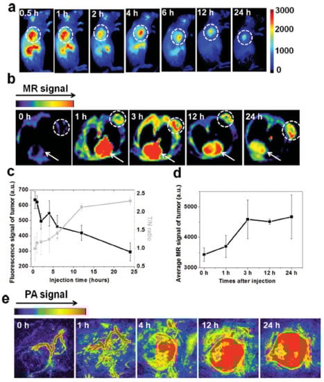(a) In vivo fluorescence imaging and (b) MRI of mice bearing 4T1 tumor cells taken at different time points post-injection with IR825@C18PMH-PEG-Ce6-Gd (200 μL, [Ce6] = 0.5 mg/mL, [IR825] = 1.3 mg/mL); dashed circles in (a) and (b) highlight the tumor, while arrows in (b) point to the heart; (c) quantification of tumor signals and tumor-to-normal tissue signal (T/N) ratios from fluorescence images shown in (a) at different post-injection times; (d) quantification of average T1-MRI signals in the tumor by manual drawn region of interest at different post-injection times; (e) in vivo PA imaging of mice bearing 4T1 tumor cells taken at different time points post-injection of IR825@C18PMH-PEG-Ce6-Gd. Reproduced from Reference [] with permission from Advanced Functional Materials, 2014.