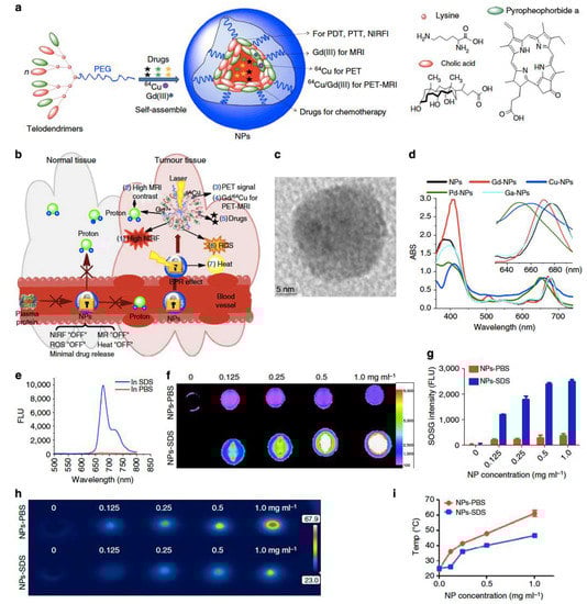 (a) Schematic illustration of a multifunctional NPor self-assembled by a representative porphyrin-telodendrimer system, PEG5k-Por4-CA4, comprised of four Por molecules and four CA moieties, attached to the terminal end of a linear PEG chain and (b) its use as a “all-in-one” nanomedicine platform against cancer; (c) TEM image of NPors; (d) absorbance spectra of NPors before and after chelating different metallic ions; (e) fluorescence emission spectra of NPs in the presence of PBS and SDS using a 405 nm excitation; (f) NIRF imaging of a NPor solution in the presence and absence of SDS with an excitation bandpass filter at 625/20 nm and an emission filter at 700/35 nm; (g) single oxygen generation of NPs in PBS and SDS after light irradiation (690 nm at 0.25 W/cm2 for 60 s); concentration-dependent photothermal transduction of NPors—(h) thermal images and (i) quantitative temperature change curve; the temperature of the NPor solution in the presence and absence of SDS was monitored by a thermal camera after irradiation with NIR light (690 nm at 1.25 W/cm2 for 20 s). Reproduced from Reference [] with permission from Nature Communications, 2014.