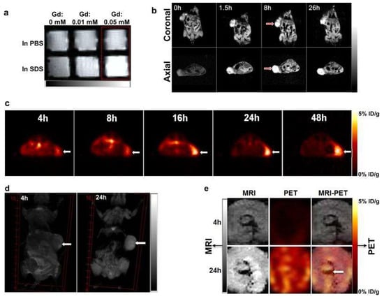NPor-mediated MRI and PET imaging in animal models. (a) MRI signal of Gd-NPors in the presence and absence of SDS obtained in vitro by T1-weighted MRI; (b) representative coronal and axial MRI images of transgenic mice with mammary cancer (FVB/n Tg(MMTV-PyVmT)) at pre-injection and post-injection of 0.15 mL Gd-NPors (Gd dose = 0.015 mmol/kg); red arrows point to the tumor site; (c) PET image of nude mice bearing SKOV3 ovarian cancer xenografts at 4, 8, 16, 24, and 48 h post-injection of 64Cu-NPors (150–200 µL, 64Cu dose = 0.6–0.8 mCi); white arrows point to the tumor site; (d) 3D coronal MRI images of nude mice bearing A549 lung cancer xenografts at 4 or 24 h post-injection with 0.15 mL of 64Cu and Gd dual-labeled NPors (150–200 µL, 64Cu dose = 0.6–0.8 mCi, Gd dose = 0.015 mmol/kg); white arrows point to the tumor site; (e) PET-MRI images of tumor slices of nude mice bearing A549 lung cancer xenografts at 4 or 24 h post-injection of dual-labeled NPors; white arrows point to the necrotic area in the center of the tumor. Reproduced from Reference [] with permission from Nature Communications, 2014.