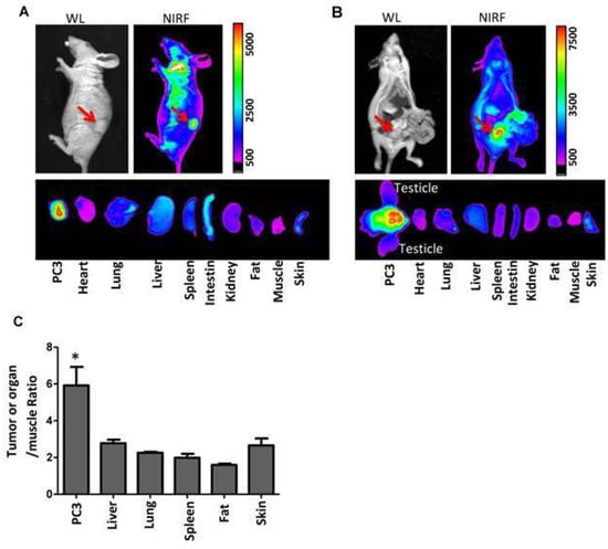 Imaging-guided drug delivery of NP-AAG in both mouse models bearing (a) subcutaneous and (b) orthotopic PC3 xenograft. In vivo and ex vivo white light (WL) and NIRF imaging of nude mice bearing subcutaneous PC3 xenograft (a) or orthotopic PC3 xenograft (b) 72 h post-injection of NP-AAG. Arrows: tumor site. (c) Analysis of NIRF imaging on each tumor and organs after normalization to the fluorescence of muscle. Reproduced from Reference [] (Theranostics 06: 1324 image No. 006, open access policy).