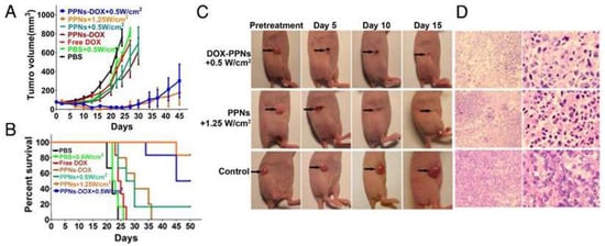 In vivo therapeutic response to PPNs-mediated chemotherapy combined with phototherapy. (A) In vivo antitumor efficacy after the intravenous treatment of various DOX formulations combined with PPNs-mediated phototherapy (n = 6). The SKOV3 tumor-bearing mice were intravenously injected with PBS (control), free DOX (2.5 mg/kg), PPNs (2 mg/kg calculated on porphyrin), and PPNs–DOX (PPNs 2 mg/kg, DOX 2.5 mg/kg) on day 0, 5, 10, and 15, followed by various light irradiations for 2 min on tumors, 24 h post-injection. (B) Kaplan–Meier survival curves of SKOV3 tumor-bearing mice treated with the above indicated conditions, where tumor volume reached 500 mm3 and was considered as the end point of survival data. (C) Photographs showing therapeutic response to PPNs-mediated phototherapy with irradiation at 0.5 W/cm2 for 2 min and 1.25 W/cm2 for 2 min, respectively. (D) H&E staining of tumor sections collected from control mice and PPNs-injected (2 mg/kg) and variously irradiated mice (0.5 W for 2 min and 1.25 W for 2 min, respectively), 24 h post-injection. Reproduced from Reference [] (Theranostics 07:3901 image No. 005, open access policy).
