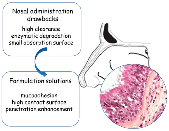 However, despite its numerous advantages, nose-to-brain drug delivery can be limited by possible low bioavailability due to enzymatic degradations of sensitive drugs onto the mucosal surface, high clearance and restrictions determined by the anatomy of the nasal cavity (e.g., small volume, limited surface area of the olfactory mucosa, mucociliary clearance, etc.). These problems should be correctly addressed in designing suitable nose-to-brain formulations (Figure 1). Despite these limitations, examples of promising results are present in clinical trials [19,20].