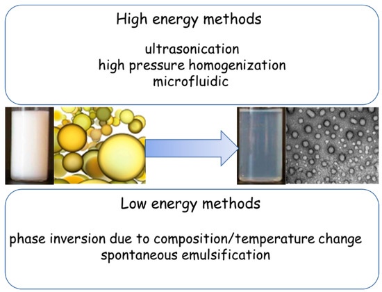 The preparation methods of NEs have been reviewed in exhaustive papers [24,32]. According to these authors, NEs can be prepared through different techniques that can be classified into two broad categories: high-energy methods and low-energy methods (Figure 2). In the case of high-energy methods, such as ultrasonication and high pressure homogenization, the constitution of the small droplets involves a mechanical device that generates disruptive forces breaking up oil and water phases to produce small oil droplets, a process that consumes significant energy. The devices used are microfluidic, ultrasound or high pressure homogenizers [33].