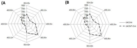 SVT nanocapsules appeared macroscopically as an opalescent white homogeneous dispersion. The total SVT content in the formulations was found to be 0.94 ± 0.04 mg·mL−1 for LNCSVT-LMWchit and 0.96 ± 0.02 mg·mL−1 for LNCSVT-HMWchit. Regarding the encapsulation efficiency (EE), SVT was not detected in the ultrafiltrate for both formulations, indicating almost complete encapsulation. The high EE achieved is probably linked to the high SVT distribution coefficient (log D) of 4.72, which confirms its great affinity for the lipophilic phase, and its concentration in the core of the nanocapsules []. Laser diffraction (LD) analysis showed D[4,3] of 150 ± 7 nm (LNCLMWchit), 157 ± 6 nm (LNCHMWchit), 163 ± 2 nm (LNCSVT-LMWchit), and 161 ± 3 nm (LNCSVT-HMWchit), with Span values of 1.3 ± 0.1, 1.3 ± 0.1, 1.4 ± 0.03, and 1.2 ± 0.2, respectively. According to the results obtained with this technique, there were no significant differences in terms of the particle diameter and polydispersity, between the formulations with and without SVT (p > 0.05). The shapes of the curves in the radar chart presented in Figure 1 are fingerprints of the formulations, which demonstrate the narrow size distributions and confirm their low polydispersities []. All of the formulations showed similar behaviors and they had d0.9 calculated both for the cumulative distribution by number, and by a volume lower than 300 nm (Figure 1).