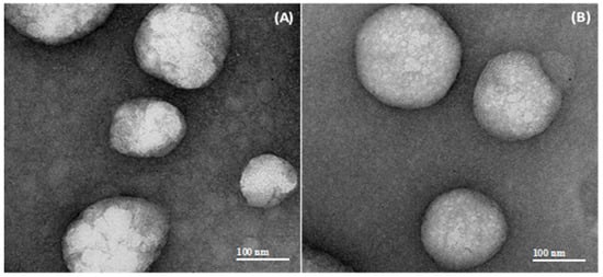 Transmission electron microscopy (TEM) micrographs (magnification 40,000×) of chitosan-coated lipid core nanocapsules: (A) LNCSVT-LMWchit and (B) LNCSVT-HMWchit.