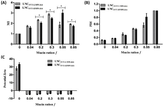 To investigate the interaction between the formulations and mucin, a mucoadhesion index (MI), the PDI, and the zeta potentials of mixtures between the nanocapsules and mucin were determined for different mucin weight ratios f (Figure 3). For LNCSVT-LMWchit in the range of f values up to 0.3, particle sizes and MI values increased to a maximum of 474 ± 6 nm and 2.9 ± 0.1 (f = 0.3), respectively. Similarly, LNCSVT-HMWchit particle size and MI increased in the f range from 0 to 0.55, reaching a maximum of 557 ± 30 nm, 3.0 ± 0.3 (f = 0.55), respectively (Figure 3A). Despite the increase of the fraction by weight of mucin above f values of 0.3, for LNCSVT-LMWchit, particle size and MI decreased to 318 ± 5 nm and 1.9 ± 0.1 for f values of 0.85. It has been hypothesized here that while at values of f of around 0.3, nanocapsules are able to form large agglomerates with mucin chains entangled and linked with more nanoparticles, above this value, the mucin is in such a large excess that almost all single particles are enrobed with mucins, leading to a decrease in the overall mean particle size. In fact, the MI values for f = 0.55 and 0.85 did not change significantly. On the other hand, for LNCSVT-HMWchit this decrease in the MI occurred only for f values above 0.55, with particle size and MI decreasing to 321 ± 7 nm, 1.7 ± 0.1 (f = 0.85). Therefore, the MI maximum was observed at lower f values (0.3) for LNCSVT-LMWchit, and higher f values (0.55) for LNCSVT-HMWchit, indicating a higher capacity to interact with larger quantities of mucin for nanoparticles coated with high MW chitosan, macroscopically translating to more efficient mucoadhesion.