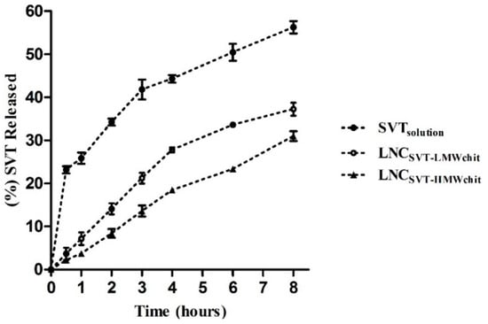 In vitro drug release profile from LNCSVT-LMWchit, LNCSVT-HMWchit and from the control (SVT solution), using the dialysis bag method at 37 °C (n = 3, ± SD).