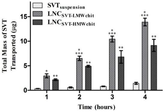 To confirm the potential permeability enhancement effects of the nanocapsules, the total amount of SVT transported across nasal mucosa model was determined by using RPMI2650 human nasal epithelial cells []. Figure 5 shows the amount of SVT transported when using the formulations, compared to a suspension of the raw material, over 4 h. After 1 h, the formulations already showed increased degrees of permeation compared to the control. However, no significant differences (p > 0.05) were observed at 1 h for the SVT permeation between LNCSVT-LMWchit and LNCSVT-HMWchit. After the first hour however, each single time point showed an amount of SVT transported to be statistically different between the formulations (p < 0.05), confirming the greater permeation of LNCSVT-LMWchit.
