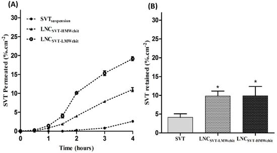 The SVT-loaded lipid core nanocapsules formulation was able to control drug release, due to the two diffusional barriers: the PCL polymer wall and the lipid dispersion present in the nanocapsule core. The nanoencapsulation reduced the diffusion rate of SVT across a dialysis membrane, confirming data that is frequently described in the literature as a property of polymeric nanoparticles []. Regarding the comparison between the two formulations, LNCSVT-HMWchit afforded better control of drug release. In order to explain the different release profiles, we evaluated the differences in terms of their physicochemical properties. Firstly, this can be explained by the higher viscosity of the chitosan used to develop the LNCSVT-HMWchit. Previous studies demonstrated that the viscosity of the chitosan is an important factor for modulating the release control []. Moreover, nanoparticle size can influence in the release profile, which increases with decreasing particle size. Indeed, LNCSVT-LMWchit had a lower mean particle diameter than LNCSVT-HMWchit, which could contribute to explaining their different release profiles, because of the greater available surface area [,].
