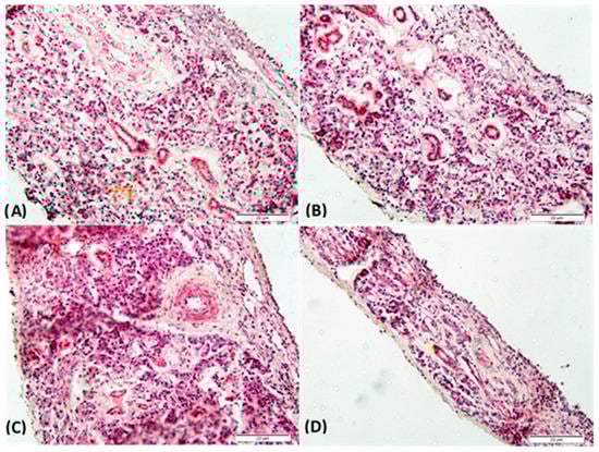 Histopathological sections of rabbit nasal mucosa after 4 h of permeation test in Franz-type diffusion cells treated with (A) PBS pH 6.4 (negative control), (B) SVT, (C) LNCSVT-LMWchit, and (D) LNCSVT-HMWchit. Sections are stained with hematoxylin and eosin.