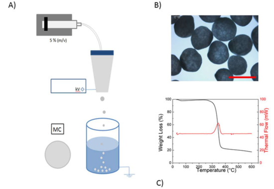A conventional EHDA process for the fabrication of MC systems is schematized in Figure 1A. Under the application of electrostatic forces over the voltage threshold, the surface tension of CA solution was rapidly overcome, thus promoting the formation of a relatively monodispersed size distribution of droplets. Once collected into the SDS-rich water bath, particles with round-like shapes (Figure 1B) were forming, due to the ionic interactions of the CA solution with SDS and water into the coagulation bath. In particular, the diffusion of water into CA micro-droplets drastically reduced acetone concentration by a thermodynamically driven stripping mechanism, which promotes the fast precipitation of CA microcapsules. This phenomenon was also controlled by the local interaction between CA and SDS macromolecules, which concurred to stabilize particle shape during the acetone removal. Hence, CA microcapsules with a narrow size distribution were obtained (Figure 1B). It is noteworthy that no relevant modification of physical properties of CA capsules was recognized after the process, as confirmed by thermal analyses (Figure 1C): weight loss and thermal flow with respect to the temperature were comparable with those from the net CA, as reported elsewhere [21]. According to previous works, the first inflection point on the TGA signal (Figure 1C, black line) at temperature lower than 100 °C, was probably due to a weight loss (about 3%) caused by the evaporation of residual humidity. On the contrary, at around 360 °C, a substantial weight loss due to polymer degradation was noticeable. At the same temperature, on the DSC signal (Figure 1C, in red), the positive peak revealed the corresponding rise of the thermal flow due to the polymer degradation [22].