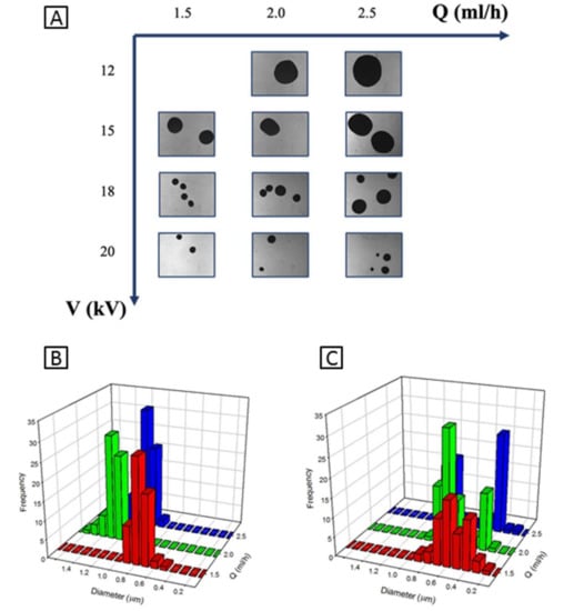 Optimization of electrohydrodynamic atomization (EHDA) for MC carriers: (A) qualitative evaluation of capsules morphology via optical microscopy and (B,C) quantitative evaluation of capsule diameters and size distribution calculated via image analysis. If the voltage is low enough, i.e., 15kV (B), then size distribution is uniform, while as the voltage increases, i.e., 18kV (C), then instability become predominant, causing heterogeneities in size.