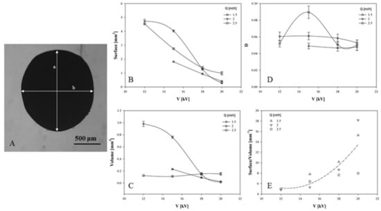 In particular, for each process condition—i.e., for each value of the imposed flow rate Q and tension V—a number of capsules ranging between 60 and 140 was analyzed, by measuring the mayor and minor axis (a and b in Figure 3A). Assuming each capsule was a rotational ellipsoid, symmetric respect to its major axis a, it was possible to calculate each capsule’s volume and external surface. In Figure 3B and Figure 3C, surface and volume are reported as a function of the voltage V, with parametric respect to the imposed flow rate Q. The average of the geometric quantity was measured over the entire sample population, and the standard error of the mean as an error bar was reported (see the lines indicated as guides for the eyes). As previously observed, capsule size is a decreasing function of the voltage, while in the range of parameters here investigated the influence of the flow rate on the size is not monotonic. The shape of CA capsules was also quantified. In Figure 3D, the deformation parameter D is reported as a function of the voltage, parametric in the flow rate. Finally, in Figure 3E the surface/volume ratio is also reported. A significant influence of the voltage V on this parameter was observed. The three data series, independently from the value of the imposed flow rate, have been fit to a polynomial curve, reported as a dashed line. This effect may be considered directly ascribable to the peculiar viscoelastic properties of the polymer solution, which is able to affect the droplet shape by the elastic deformation of the polymer solution at the tip of the needle, imparting an elliptical shape to the droplets’. In order to better control the shape, polymer solutions with different viscosities have been investigated in past literature [23]. Hence, two solutions with different viscosities have been used for the fabrication of biphasic CA capsules. This has allowed the containment of capsule elongation, also influencing specific functionalities for a controlled release of anti-inflammatory drugs. Recent studies have demonstrated the versatility and high feasibility of the EHDA process to particularize properties and functions of micro-sized devices by the easy customization of the process setup configuration, in order to obtain tailored systems for different applications in biomedical areas (i.e., regenerative medicine, drug delivery, bio-cosmetics, bio-packaging) [17,24] that are easily scalable for industrial production [25].
