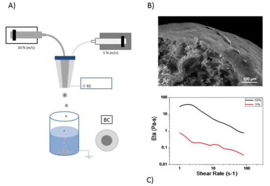 BC capsules: (A) scheme of preparation; (B) cross-section image via LV-SEM; (C) viscosity vs. shear rate in the case of inner (black) and outer (red) CA solutions.