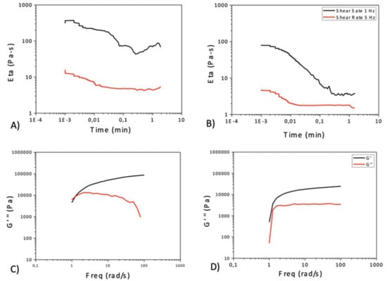 (A,B) Relationship between viscosity and time at different values of the applied shear rate (1 Hz and 5 Hz, in black and red, respectively), for the two cellulose acetate solution (10% (A) and 5% (B) concentrated). (C,D) Elastic module G’ (in black) and viscous module G’’ (in red) as a function of frequency, for both cellulose acetate solutions (10% (C) and 5% (D), respectively).