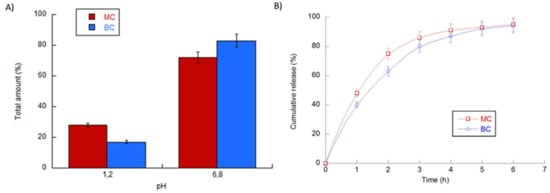Release properties of BC and MC micro-vectors. (A) KL total amount (%). All samples were conditioned into simulated gastric fluids (SGF) (pH 1.2) for the first 2 h, and simulated intestinal fluids (SIF) (pH 6.8) for the next 6 h, until the end of release. (B) Cumulative release in SIF (%). All tests were conducted in triplicate for each time, for both sample populations.