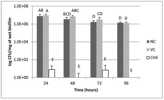 Bacterial viability of P. gingivalis biofilms according to treatments. NC= negative control (without exposure to formulation); VC= vehicle control; CHX= chlorhexidine-based chitosan formulation. Data expressed as mean ± standard deviation in logarithmic scale (n = 6). Values that do not share the same letter (A, B, C, D, E) are significantly different from each other; Shapiro–Wilk test followed by Tukey–Kramer post-hoc test, p < 0.05.