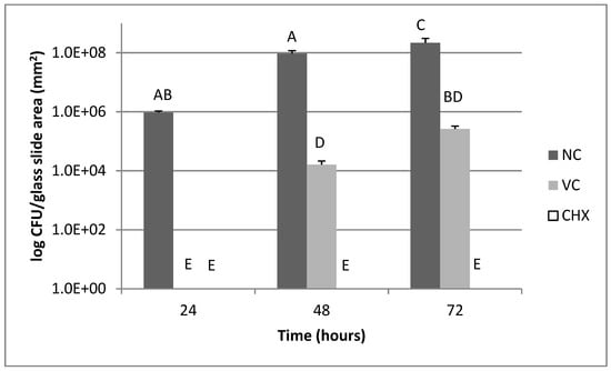 Regarding bacterial viability of P. gingivalis biofilms (Figure 2), the lowest bacterial count was found after treatment with the CHX group at all times (p < 0.05) but did not differ from VC at 24 h. The VC group was different from the NC group for all times (p > 0.05). The NC group achieved the highest bacterial viability in 72 h compared to 24 and 48 h (p < 0.05).