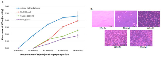 (A). Turbidity and optical microscopic analysis of differently formulated NPs. Turbidity (absorbance at 320 nm) of the particles formed without and with NaCl and/or glucose. Particles were formed by addition of 1–5 μL of (1 M) SrCl2 to 0.5 μL of (1 M) Na2SO3 in 50 µL aqueous solution with or without inclusion of 25 μL of NaCl (0.5 M) and/or 10 μL of d-glucose (1 M), and incubation for 30 min at 37 °C. Subsequently, serum-supplemented DMEM media was added to achieve 1 mL particle suspension. Absorbance at 320 nm wavelength was measured for all generated NPs using a spectrophotometer. (B). Microscopic observation of Na-Glc-SSNs prepared at different Sr2+ concentrations, and images were captured at 10× resolution.