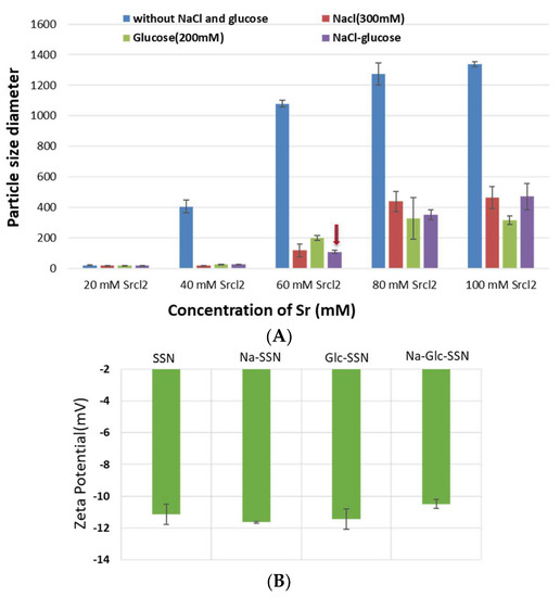 Since particle diameter is crucial in regulating pharmacokinetics and tumor targeting of particle-loaded therapeutics, we measured the average particle size by Zetasizer and investigated the effects of NaCl and glucose in the stabilization of particle diameter. As shown in Figure 2, the average size of SSNs without NaCl and glucose ranged from 20 nm to 1.3 µm, with a trend of forming larger particle with increasing Sr2+ concentrations, while addition of NaCl and glucose to the reaction mixture reduced the particle sizes of SSNs (i.e., Na-Glc-SSNs), which varied from 20 nm to 463 nm depending on the concentration of SrCl2 in a similar trend as in the turbidity study (Figure 2A). The surface charge of NPs is crucial for stability in systemic circulation, cellular uptake and successful delivery of drug into the target tumor cytoplasm. The zeta potential of SSNs, Na-SSNs and Glc-SSNs were almost same and remained in the range of −10.7 mV to −11.9 mV, whereas incorporation of NaCl and glucose into the SSNs slightly reduced the zeta potential (−10.5). The combination of NaCl and glucose reduced the size and stabilized the growth of Na-Glc-SSN more significantly than SSNs formed without NaCl and glucose. We propose that NaCl prevents particle aggregation by temporary binding with SrSO3 particles through its cations (Na+) and anions (Cl−) (Figure 3A), whereas glucose may be partitioned between the particles, thereby producing less aggregated and small sized particles (Figure 3B).