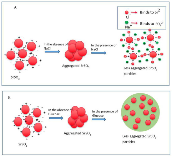 Schematic representation of effects of NaCl and glucose in stabilization of SrSO3 particles. (A) SrSO3 particles stick to each other to form aggregates, while NaCl slows down the particle formation by temporally binding with Sr2+ and SO32−. (B) Without d-glucose, SrSO3 particles bind to each other forming large particles, but glucose lies between the particles and forms a shield to prevent particle-particle agglomeration.