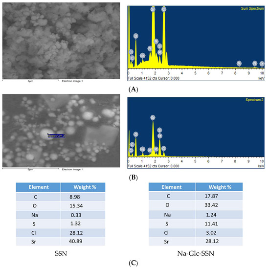 EDX analysis of nanoparticles. EDX spectrum of SSNs (A) and Na-Glc-SSNs (B) nanoparticle (C) Element weight percent of SSNs and Na-Glc-SSNs.