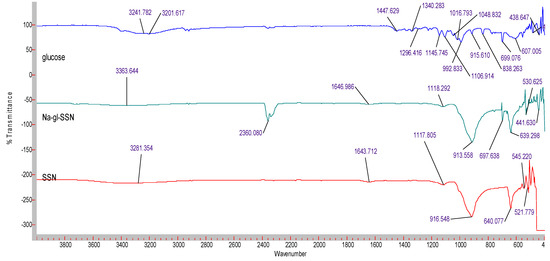 FTIR spectra for free glucose, SSNs (formed using 60 mM of SrCl2 and and 10 mM of Na2SO3) and Na-Glc-SSNs (formed by adding 60 mM of SrCl2, 300 mM of NaCl, 200 mM of glucose and 10 mM of Na2SO3).