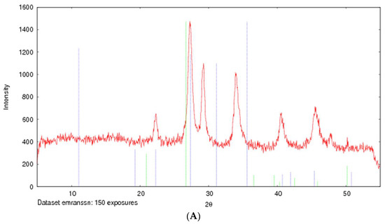 XRD patterns of SSNs (formed with 60 mM of SrCl2 and 10 mM Na2SO3, (A) and Na-Glc-SSNs (formed with 60 mM of SrCl2, 300 mM of NaCl, 200 mM of glucose and 10 mM of Na2SO3) (B).