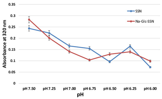 SSNs were prepared by mixing 60 mM of SrCl2 and 10 mM of Na2SO3 and Na-Glc-SSNs were prepared by the addition of 60 mM of SrCl2, 300 mM of NaCl, 200 mM of d-glucose and 10 mM of Na2SO3, followed by incubation for 30 min at 37 °C. After the incubation, DMEM of different pHs was added to make the final volume 1 mL. The different pHs were adjusted by using 1 N HCl and the absorbance was measured at 320 nm wavelength by using a spectrophotometer. Experiments were done in triplicate and the data were plotted with mean ± SD.