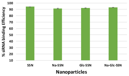 The binding affinity of siRNA towards nanoparticles is vital to prevent its nuclease-mediated siRNA degradation and dissociation from the particles after being exposed to blood components. siRNA, which is negatively charged due to its phosphate backbone was expected to interact with strontium sulfite nanoparticles owing to their positively charged Sr2+-rich domains. As shown in Figure 10, SSNs, Na-SSNs, Glc-SSNs and Na-Glc-SSNs demonstrated significant binding affinity (ranging from 91% to 94%) towards the siRNA, suggesting that the potential ability of the nanoparticles in carrying siRNAs into cancer cells by preventing nuclease-mediated degradation and enhancing cellular uptake via endocytosis.