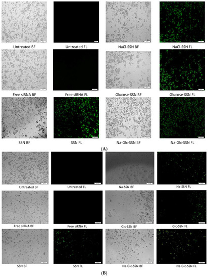 Cellular uptake of siRNA, one of the most critical steps in regulating overall silencing efficacy is predominantly influenced by siRNA binding affinity for nanoparticles and size of the particles. The small particles are expected to have more cellular internalization in comparison to larger ones. MCF-7 cells were treated with differently formulated strontium sulfite nanoparticles for 4 h prior to removal of extracellular particles with EDTA and subsequent observation by a fluorescence microscope. After 4 h of treatment, as shown in Figure 11A, untreated cells and cells treated with free siRNA did not show any fluorescence signals. On the other hand, cells treated with all different forms of strontium sulfite particles revealed significant fluorescence signal. However, after 12 h of treatment, cells treated with SSNs coupled siRNA gave more significant fluorescence signal as demonstrated in Figure 11B, suggesting their efficient internalization into the breast cancer cells in extended time. The fluorescence intensity of Na-Glc-SSNs at 4 h was much higher than that of free siRNA and SSNs, as shown in Figure 12A.