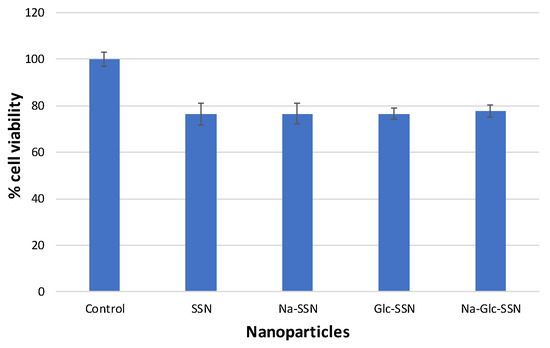 Cytotoxicity of SSN, Na-SSN, Glc-SSN and Na-Glc-SSN in MCF-7 cells was assessed by MTT assay. 5 × 104 cells were seeded in a 24-well plate in triplicate. On the following day, the cells were incubated with SSNs, Na-SSNs, Glc-SSNs and NA-Glc-SSNs for 48 h and MTT assay was conducted. Briefly, 50 µL of MTT (5 mg/mL in PBS) was added to each well and incubated for 4 h. After dissolving the resulting formazan products with 300 µL of DMSO (dimethyl sulfoxide), the absorbance was analyzed on a microplate reader (microplate spectrophotometer, Biorad, Hercules, CA, USA) at 595 nm wavelength with reference to 630 nm.