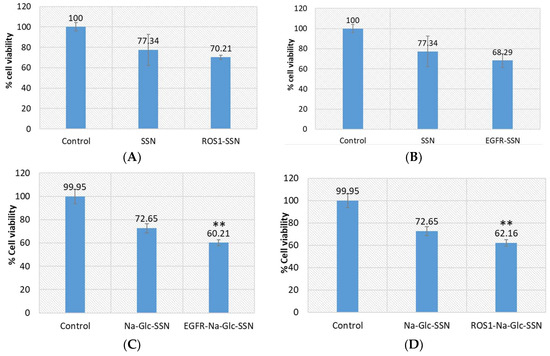 Cell viability assay following exposure of MCF-7 cells to SSNs and Na-Glc-SSNs with loaded ROS1 or EGFR siRNA. Cells were treated with particles alone and siRNA-loaded particles. SSNs and Na-Glc-SSNs were prepared by adding 60 mM SrCl2, without and with 300 mM of NaCl and 200 mm of d-glucose into 10 mM of Na2SO3. 1 nM of siRNA was used for fabrication of siRNA-loaded particles. Values are represented as % of cell viability in comparison to control for triplicate samples. (A). SSNs with loaded siRNA against ROS1. (B). SSNs with loaded siRNA against EGFR. (C). Na-Glc-SSNs with loaded siRNA against ROS1. (D). Na-Glc-SSNs with loaded siRNA against EGFR. Values were very significant (**) at p value 0.001 to 0.01 compared to NPs treatment.