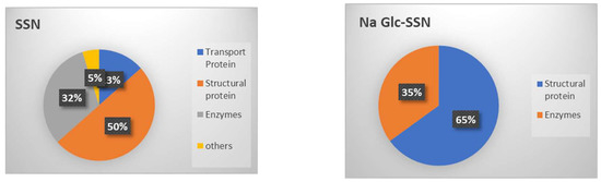 The interactions between the proteins present in the serum and the surface of SSNs were analyzed by LC-MSLC-MS/MS Q-TOP. The in-solution digestion of the protein corona formed around SSNs and Na-Glc-SSNs was carried out to detect the peptides. The peptides derived from de novo sequencing were identified as exact or homologous peptides using the Mus_musculus database (SwissProt). The protein corona profile was characterized with the help of unique peptide, molecular weight, coverage % for peptides and significance (−10lgp). Detected proteins were listed along with their functions in Table 1 and Table 2 for SSNs and Na-Glc-SSNs. Protein classification based on their biological functions was plotted in a pie chart (Figure 15).